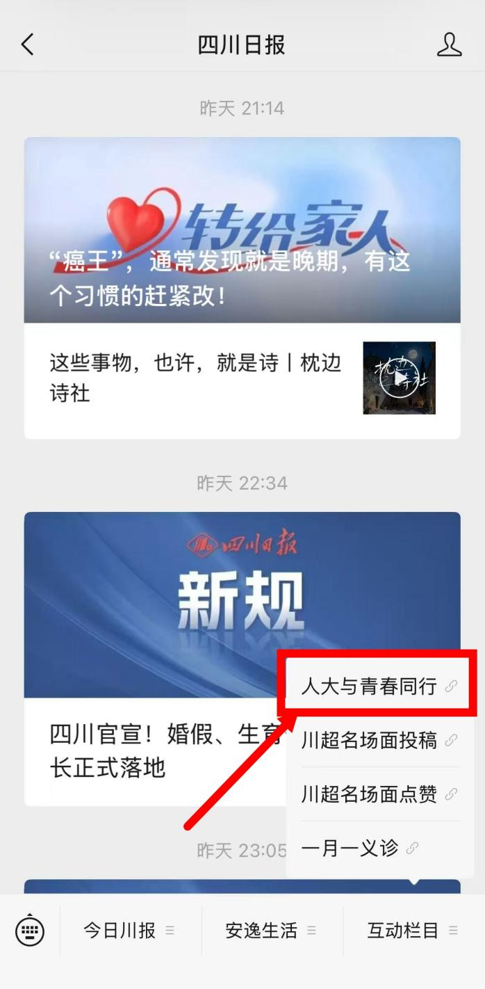 关注“四川日报”微信公众号,进入菜单栏选择“互动栏目”,点击“人大与青春同行”。