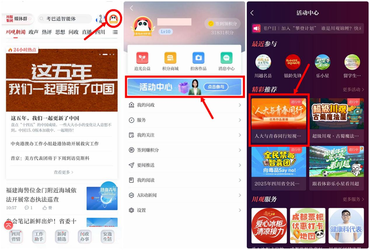 下载川观新闻客户端最新版本,并用手机号完成登录。在川观新闻首页,右上角点击“我的”,进入“活动中心”,找到“人大与青春同行优秀视频展播”活动图片,点击即可参与;